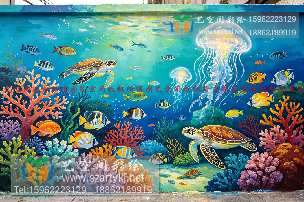苏州绘画打造高品质海洋世界主题彩绘,全场景量身打造,告别传统墙漆单调质感、摒弃墙贴生硬边角,纯手工肌理上色,贴合原生墙面自然弧度,立体通透不突兀,长效耐用不掉色、不起皮、无刺鼻异味,居家商用安心适配。整体色调甄选深海蓝渐变基底,层层叠叠晕染出海水流动光影,灵动热带鱼群结伴穿梭软质珊瑚丛,蓬松海草随隐形洋流轻轻摇曳,错落点缀星光气泡、温润贝壳、圆润礁石,细节写实饱满,光影层次拉满,远观氛围感治愈松弛,近看笔触细腻干净,轻奢耐看不浮夸。适配儿童房全屋墙面、客厅背景主墙、玄关空白立面、休闲茶室边角区域,也可全覆盖民宿客房、海景公寓、休闲会所公共区域等。